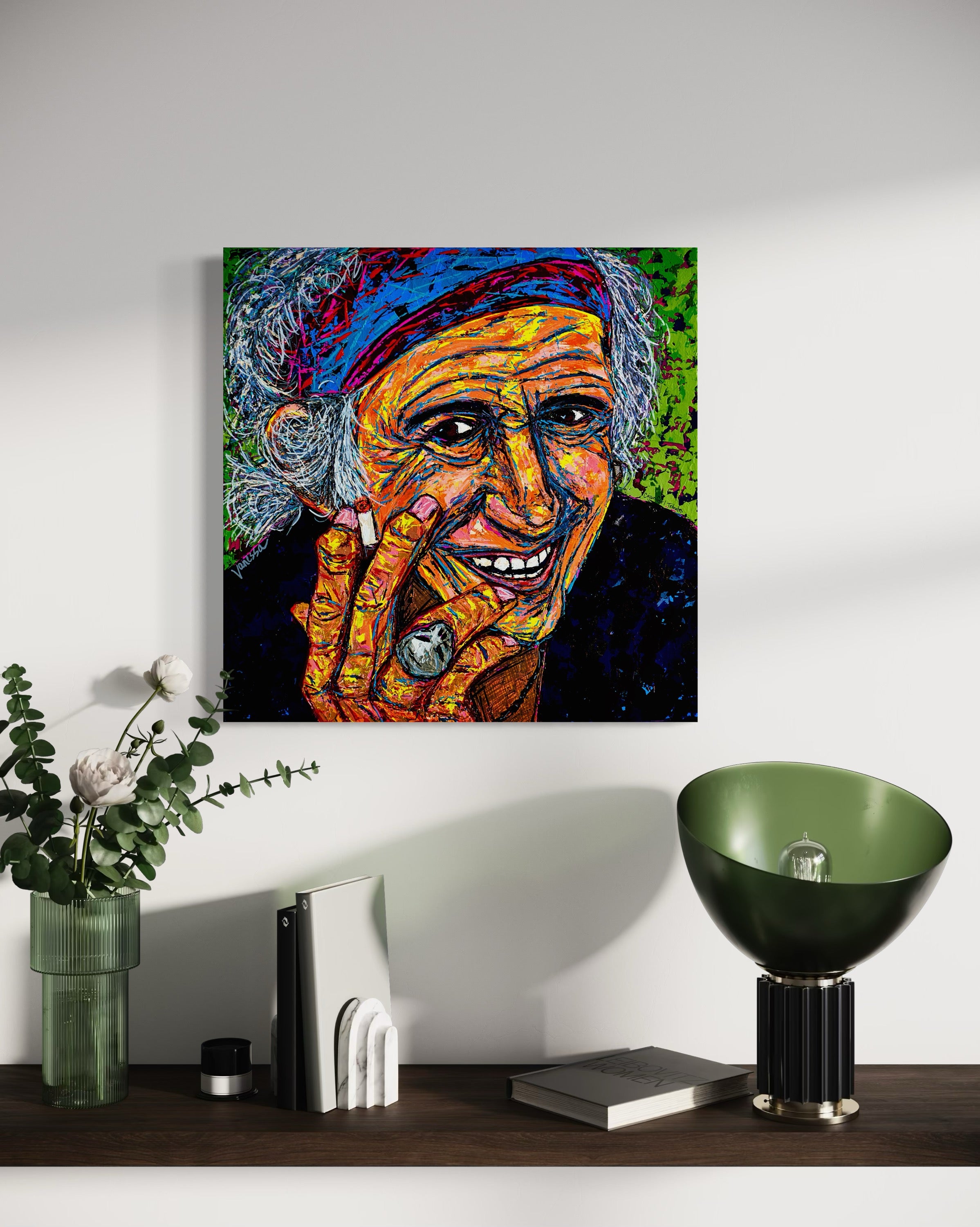 The shy sista to Frida. She may be shy to the spot light but bold enough to be in the room. Beautiful combination of colors, texture and painting techniques.